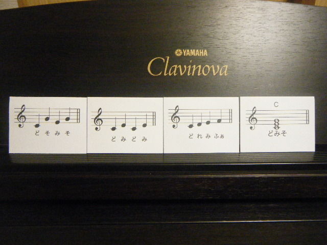 これを、初見(譜面を初めて見ると同時に弾いていく)で左から弾いていくのですが、初見では難しい~!というようだったら、裏返せば、どれみが書いてあります(^-^)