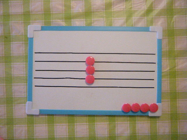 以前もホワイトボードを使った五線ボードを作りましたが、かなり大きいものだったので、小さいものに作り直しました。