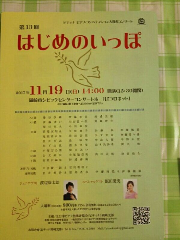 こんにちは! 11月19日(日)コンペティション入賞者によるコンサートがあります。 幼児を含め、子供たちの素敵な演奏が楽しめます。 コンペティションのレベルも分かりますよ。 招待券1枚あるので、欲しい方に差し上げます。(早い者勝ちです)