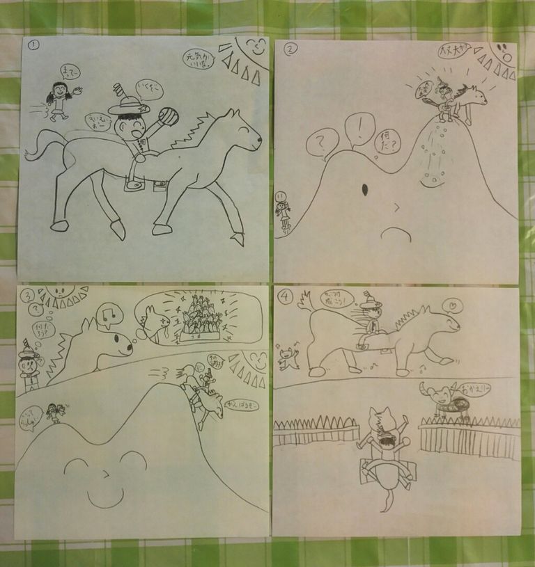 ご機嫌で乗馬を楽しんでいる表情や、最後、山を降りて牧場に戻る様子が、かわいいイラストで描かれています。